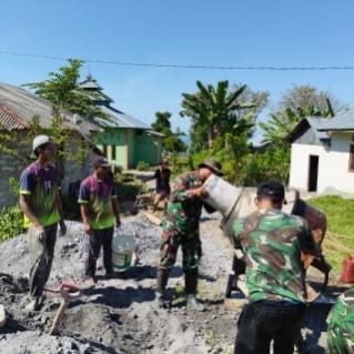Prajurit TNI dari Koramil 1612-05/Satarmese bersama warga setempat bahu-membahu memperbaiki jalan menuju Masjid Al-Bahar Waemaras sepanjang kurang lebih 20 meter.