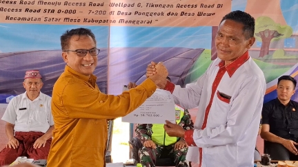 Kegiatan pelepasan objek pengadaan tanah sekaligus pemberian ganti kerugian kepada 258 pemilik lahan berlangsung di Halaman Gendang Wewo, Desa Wewo, Kecamatan Satar Mese, Kabupaten Manggarai, Provinsi Nusa Tenggara Timur (NTT), Kamis (12/3/2026).