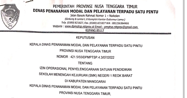 Manggarai, Info1news.Com – Sekolah Menengah Kejuruan Negeri (SMKN) 1 Reok Barat yang terletak di Kajong Desa Kajong Kecamatan Reok Barat Kabupaten Manggarai Nusa Tenggara Timur, sudah mendapatkan Surat Keputusan (SK) Kelembagaan dan Surat izin Operasional.