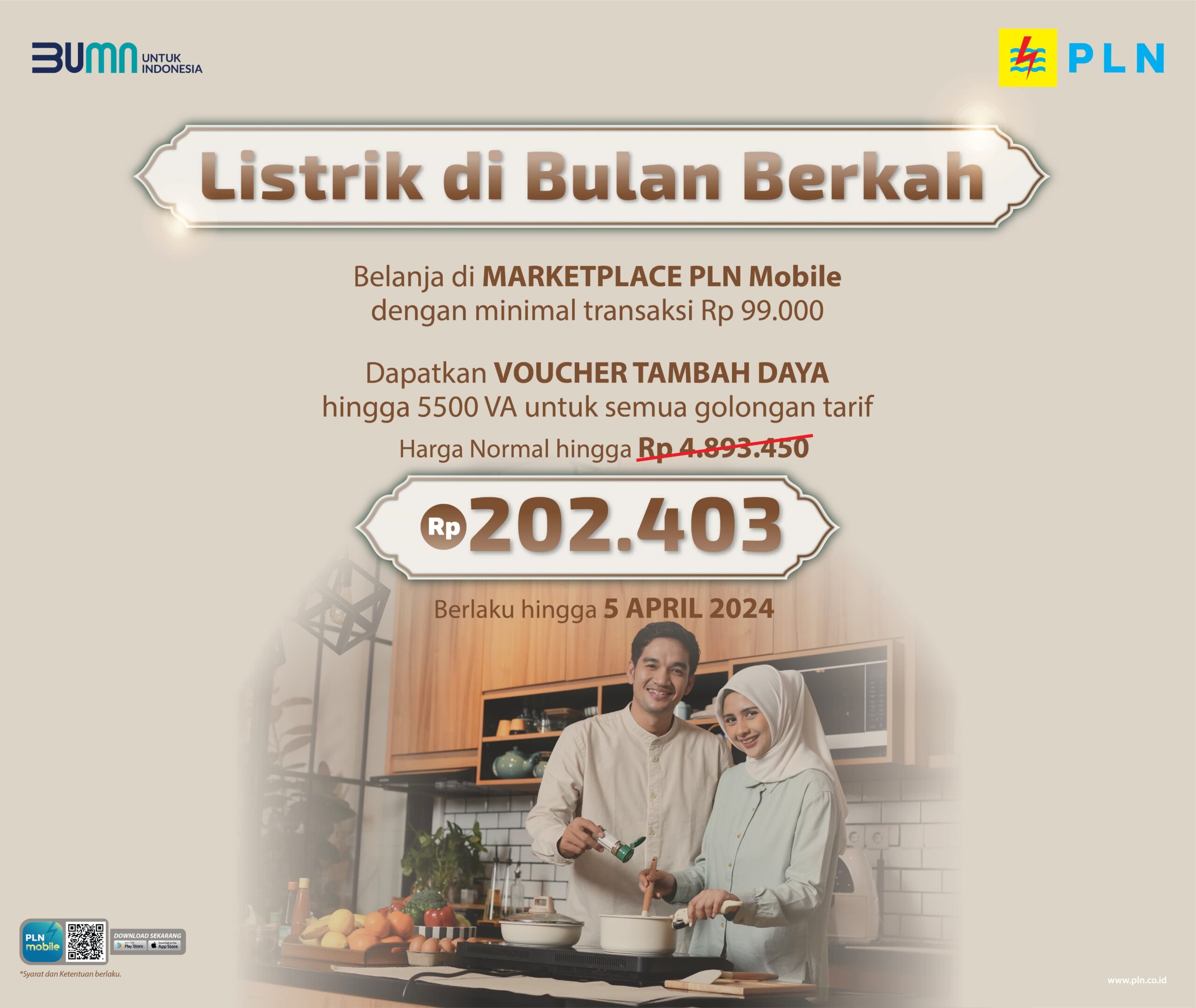 Promo ini berlaku hingga 05 April 2024 dan bisa didapat hanya melalui fitur ‘Marketplace’ di aplikasi PLN Mobile dengan syarat dan ketentuan yang berlaku.