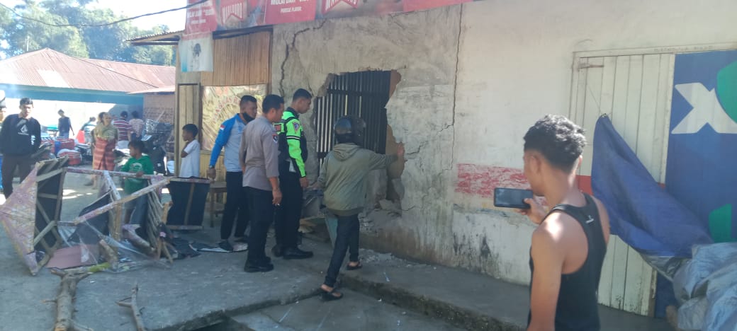 Akibat kejadian tersebut, dinding tembok kios tersebut jebol sehingga bolong dan beberapa barang kios rusak dan berserakan di lantai bagian dalam kios. Dinding tembok yang jebol dan bolong luasnya diperkirakan 3 x 2 meter.