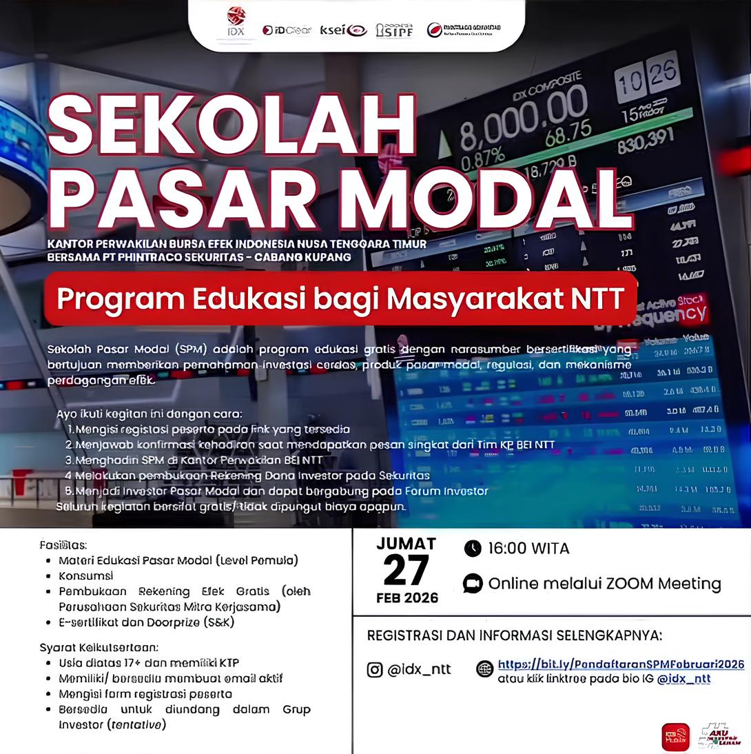 KUPANG, Info1news.com- Kantor perwakilan Bursa Efek Indonesia (BEI) Nusa Tenggara Timur (NTT) bersama Pinthraco Sekuritas cabang Kupang, menggelar Sekolah Pasar Modal (SPM) gratis bagi warga NTT yang ingin melek investasi.